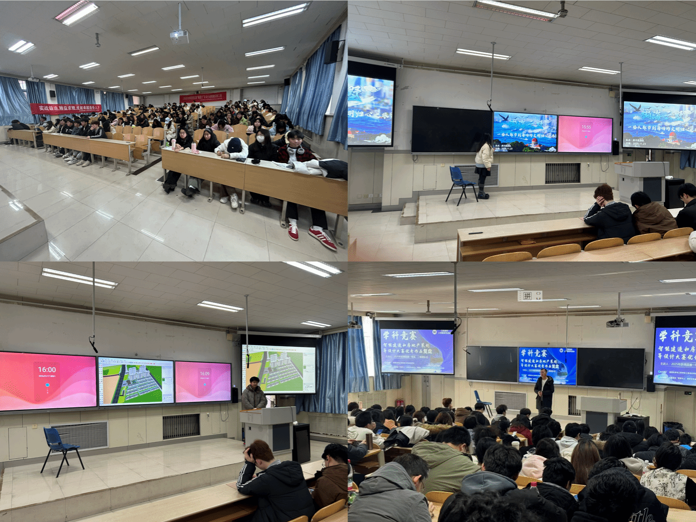 本次活动打破传统的老师为学生作报告模式,邀请2025年获得全国智能建造和房地产策划等设计大赛分赛道一、二等奖的队伍学生代表进行汇报,带来了不一样的汇报效果。首先,参加第十七届全国大学生房地产策划大赛获得城市更新策划项目二等奖的队伍实干先锋队为同学们带来了汇报复盘,队长徐毅翀首先从大赛宗旨、赛题设置、比赛规则等方面介绍了本次大赛基本情况,马柯从项目背景、项目概况、策划任务要求、评审标准和成果及参赛要求等方面解读了城市更新项目策划任务书并强调了如何解题破题,朱冠宇从团队构成及分工、团队组成与特色、第一阶段文稿撰写与修改(项目策划案)和第二阶段成果整合与展示准备等方面介绍了团队分工情况,徐毅翀从探寻幸福之源、锚定幸福之基、精算幸福之值、筑牢幸福之魂、护航幸福之路、勾勒幸福之卷六个方面展示了队伍参赛作品“兴华 颐乐家-太原兴华北小区适老宜居共生策划”并进行了视频展示。