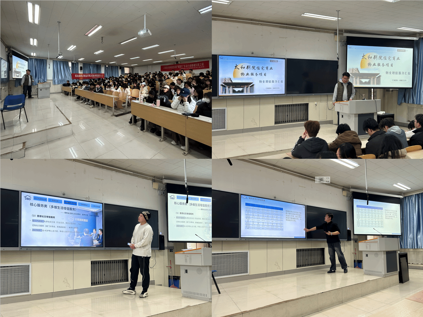 第二组汇报队伍是参加第二届全国大学生物业管理职业技能大赛物业增值服务方案策划方向的楼巅汪汪队,其获得了本次全国赛一等奖,其作品为“晋中市太谷区太和别院住宅及商业物业服务项目物业增值服务策划”。首先队长王一民从地理位置、区位分析、相关政策法规和政策解读等方面介绍了该项目策划的区位与政策,从场景画像、痛点分析、商业业态和趋势切入等方面介绍了太和别院调研整合研究及全景现状;其次,队员张霄鹏从构建“载体支撑+核心服务+运营保障+延展服务”多元增值服务产品线、构建“空间-智慧-服务-运营”四维协同体系开展整体规划管理等方面介绍了增值服务产品,强调了组织与风险、平衡与迭代、核心增值、延展增值及增值内容创新,从借款还本付息估算表、预期的利润情况、全部投资的现金流量分析、财务计划现金流量表、资产负债情况、项目不确定性分析、评价结论和风险分析等方面提出太和别院物业增值服务可持续性验证;最后,队员邵礼琛介绍了本策划项目的服务生态、资源激活、运营模式、代际与文化等创新亮点,民生保障、社区治理、产业带动等社会价值,为在座所有同学展示了成果视频并进行解读获奖主要原因。