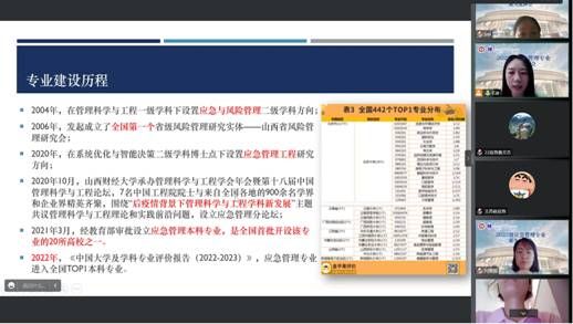2022年9月20日下午,应急管理专业在云端举办新生导师见面会,应急管理教研室全体教师参加会议,会议由应急管理教研室主任王迪主持。会议第一阶段,王迪老师对我校应急管理专业建设历程重要节点进行介绍。2021年3月,经教育部审批,必威西汉姆联设立应急管理本科专业,成为全国首批开设该专业的20所高校之一;2022年,根据《中国大学及学科专业评价报告(2022-2023)》,必威西汉姆联应急管理专业进入全国TOP1本科专业。专业紧密围绕习近平总书记提出的国家安全观的顶层要求,通过合理的课程体系设计,旨在培养拥有高度社会责任感、具备国际视野、创新精神、德智体美劳全面综合发展的高素质应急管理人才。会议第二阶段,由应急管理教研室副主任闫慧丽老师介绍教研室师资力量,应急管理教研室师资力量雄厚,现有教授3人,副教授4人,讲师3人,博士化率100%,已在灾害风险、人工智能、应急物流与供应链管理、应急安全管理、应急技术管理、应急决策理论与方法等领域形成了学科融合度广、职称结构合理的师资队伍,能够有力支撑“本-硕-博”完整的应急管理人才培养体系。同时,在人才培养过程中,专业突出理论教学、实践训练和应急管理规划与设计相融合,在开展应急管理理论教学与科学研究的同时,为学生提供创新创业、学科竞赛指导,以及应急管理大讲堂特色活动,搭建“学科竞赛+科研项目+应急演练”三位一体的个性化育人平台。
