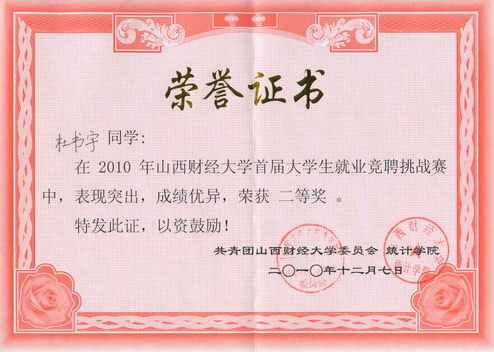 2010年12月7日,我院杜书宇同学在2010年必威西汉姆联首届大学生就业竞聘挑战赛中荣获二等奖。