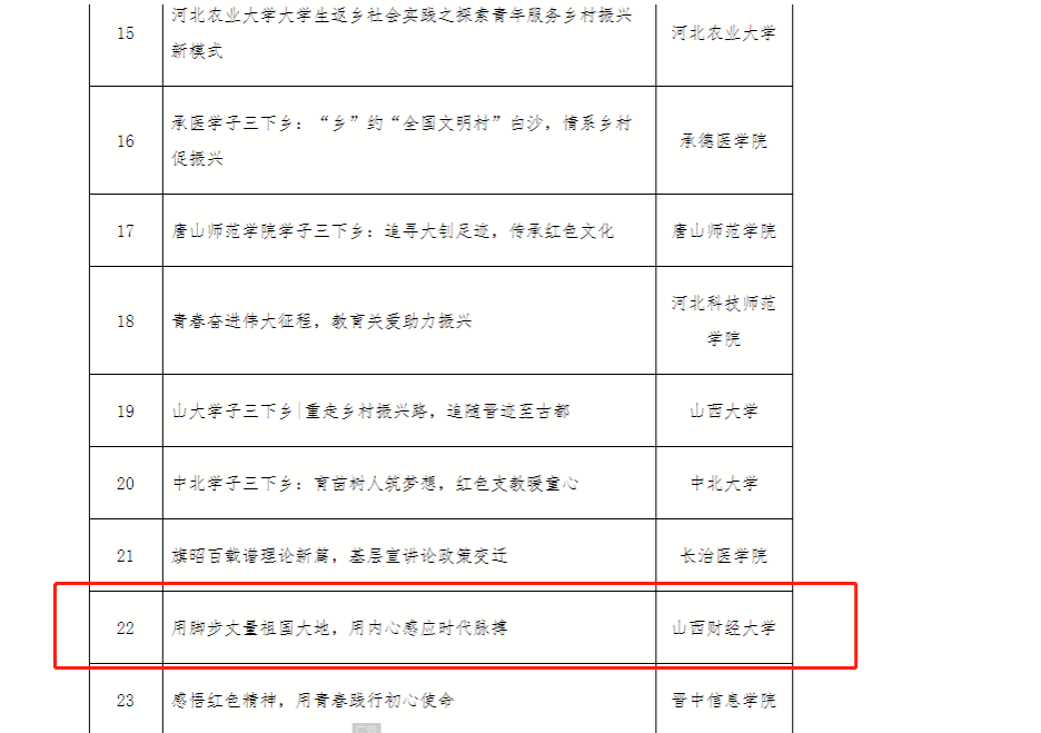 近年来,我校高度重视暑期“三下乡”社会实践活动的开展,从平台搭建、资金保障、团队管理、专业指导等方面给予大力支持。2022年暑假期间,校团委采取点面结合、分散与集中并举、线上线下相结合的方式,搭建“国家重点团队—省级重点团队—校级实践团—院级实践团”四级梯队,广泛、有效地组织动员青年学生参与社会实践。上万名财大学子围绕乡村振兴、“追寻总书记足迹”“百乡千村”“让晋商文化火起来”等主题,进行理论宣讲普及、党史学习教育、乡村振兴促进、发展成就观察等形式多样的“三下乡”社会实践活动,引领广大青年学生通过社会实践为实现中华民族伟大复兴的中国梦汇聚磅礴青春力量。活动的扎实开展,得到了实践地干群的肯定和欢迎,也得到中青校园、中国青年网、山西青年报等媒体平台报道,深化了实践育人成效,扩大了学校的知名度,同时增强了广大学生勇于担当、敢于作为、不断创新的青年骨气。