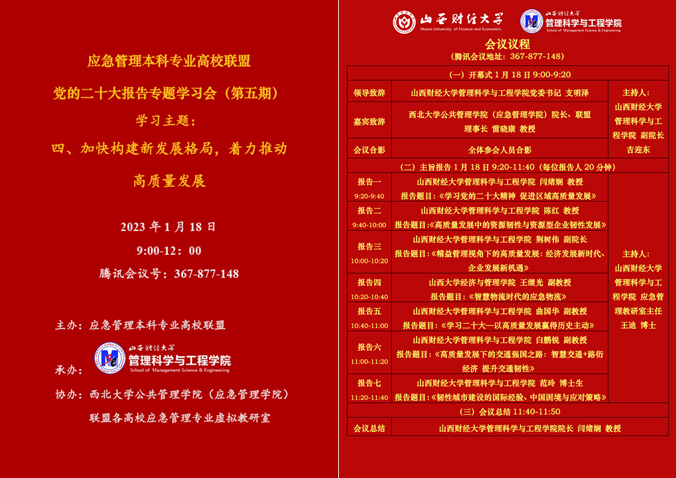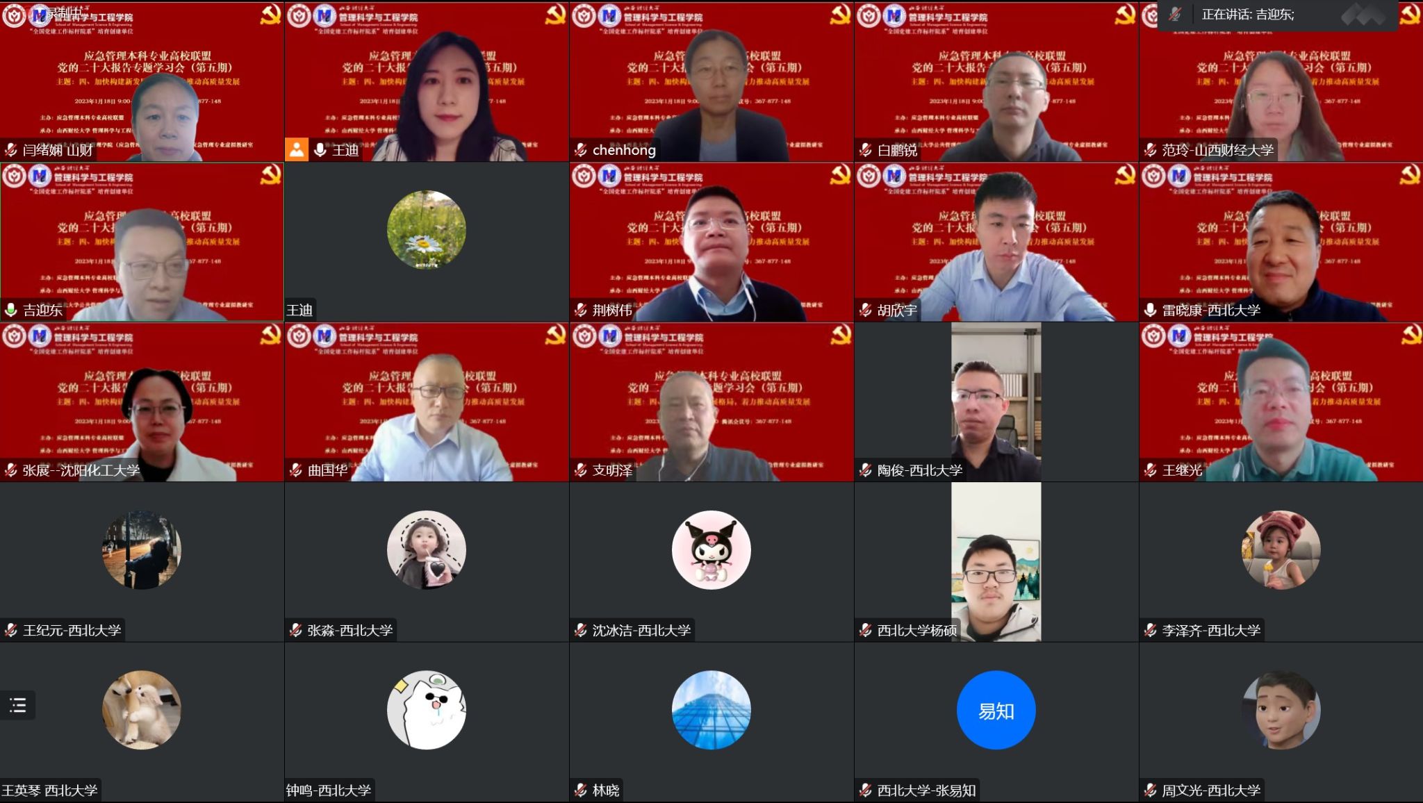1月18日上午,由应急管理本科专业高校联盟主办,必威西汉姆联承办,西北大学公共管理学院(应急管理学院)、联盟各高校应急管理专业虚拟教研室协办的党的二十大报告专题学习会(第五期)成功召开。与会人员围绕“加快构建新发展格局,着力推动高质量发展”这一主题认真学习研讨,来自西北大学、中国地质大学、中国矿业大学、沈阳化工大学、武汉理工大学、河南理工大学、山西大学等应急管理本科专业高校联盟各个院校的师生和专家学者参加了学习会。